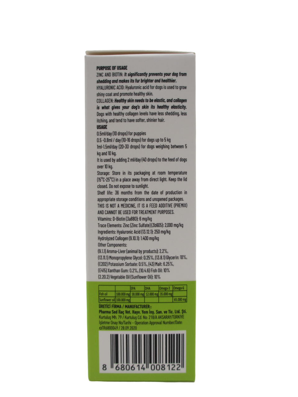- Hyaluronik Asit: Parlak tüyler yetiştirmek ve sağlıklı cildi teşvik etmek amacıyla kullanılır.