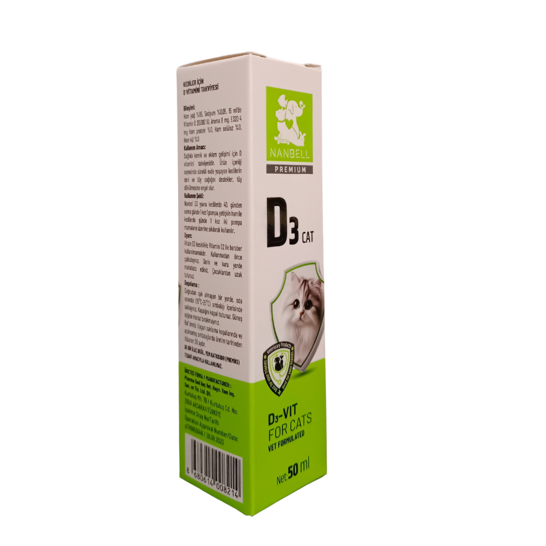 Kullanım Amacı: Nanbell D3 Cat, sağlıklı kemik ve eklem gelişimi için ideal bir D vitamini takviyesidir. Ayrıca, sürekli evde yaşayan kedilerin deri ve tüy sağlığını destekler, tüy dökülmesini engeller.